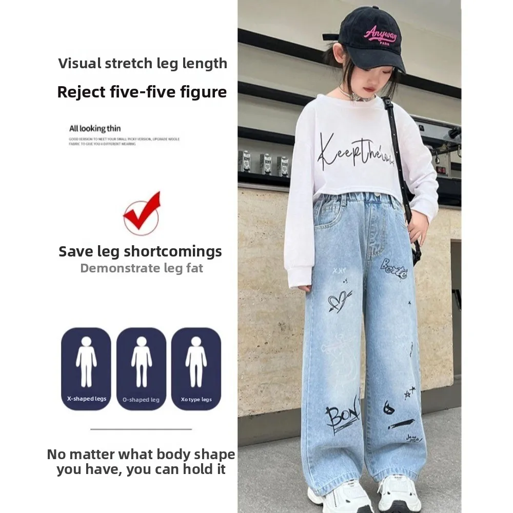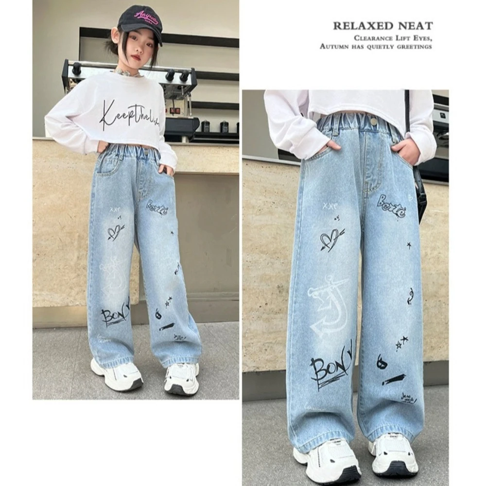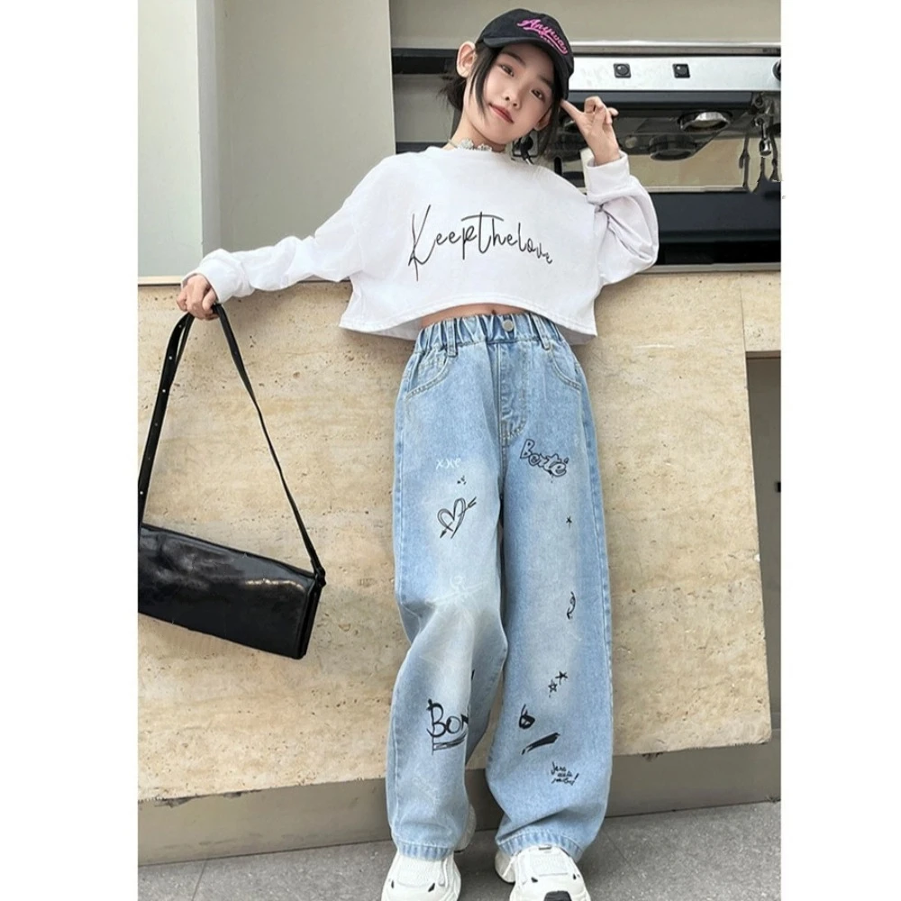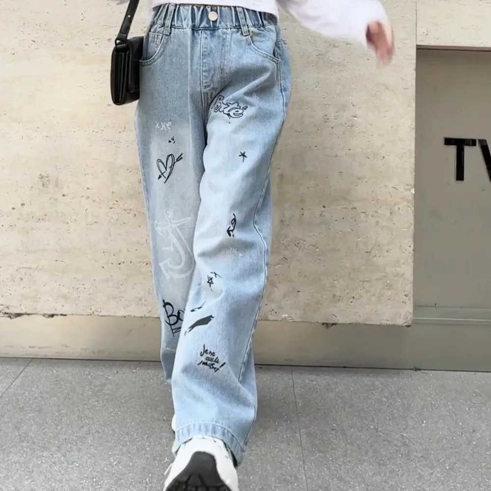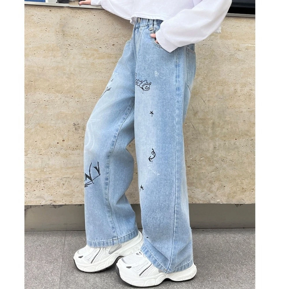 English Letter Children Jeans Straight Loose Leg Blue Teen Girl Jeans Korean Style High Waist Girls Denim Trousers Spring Autumn