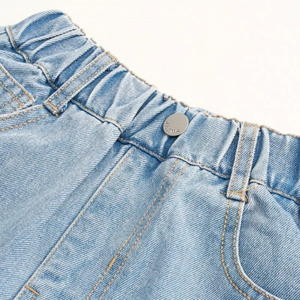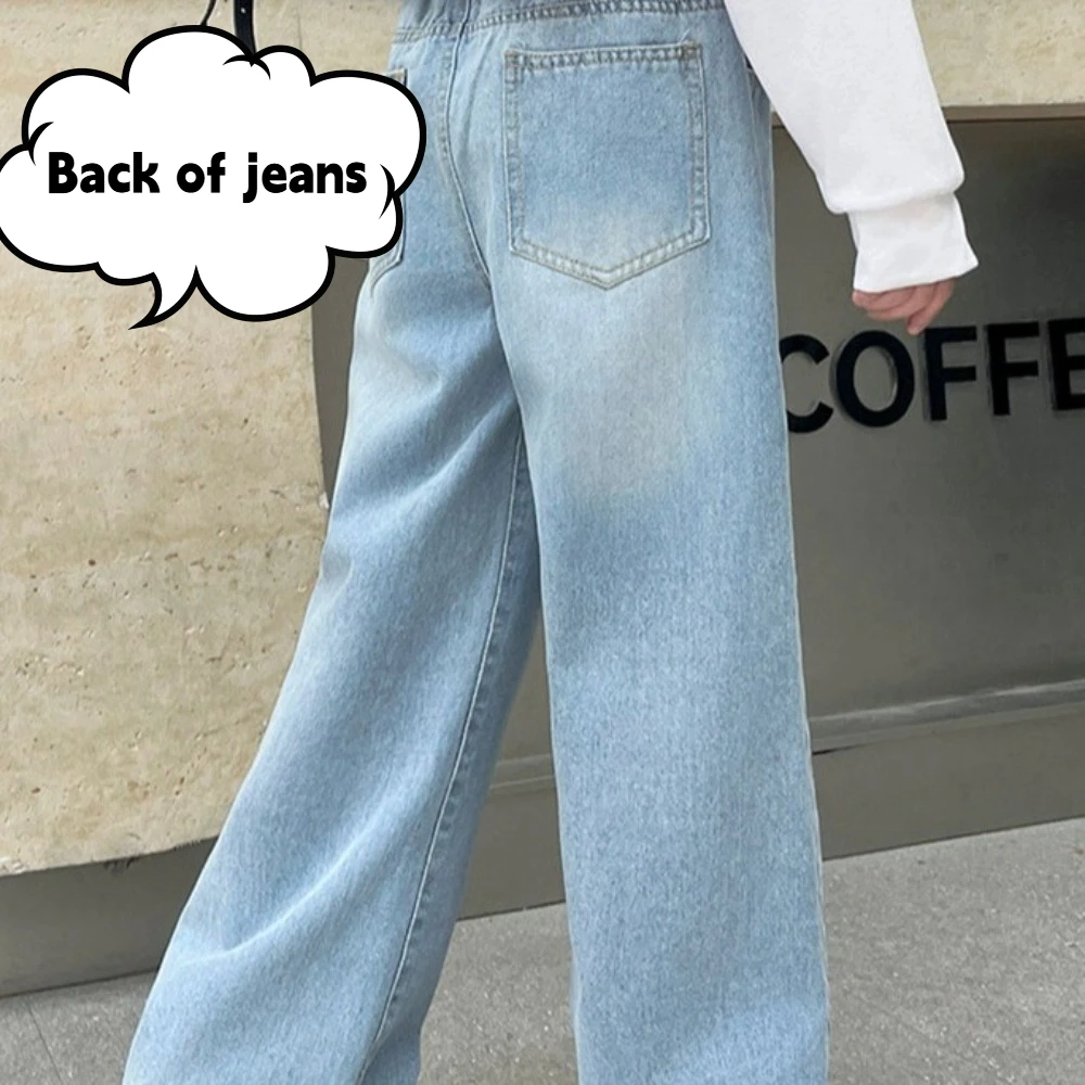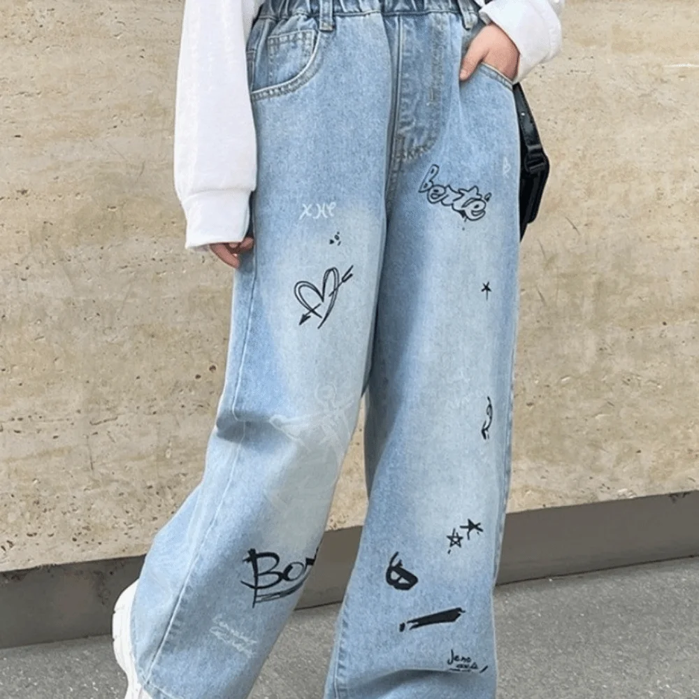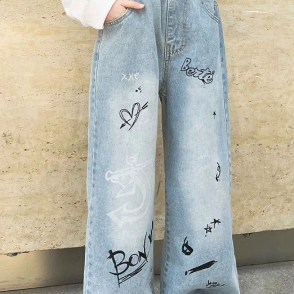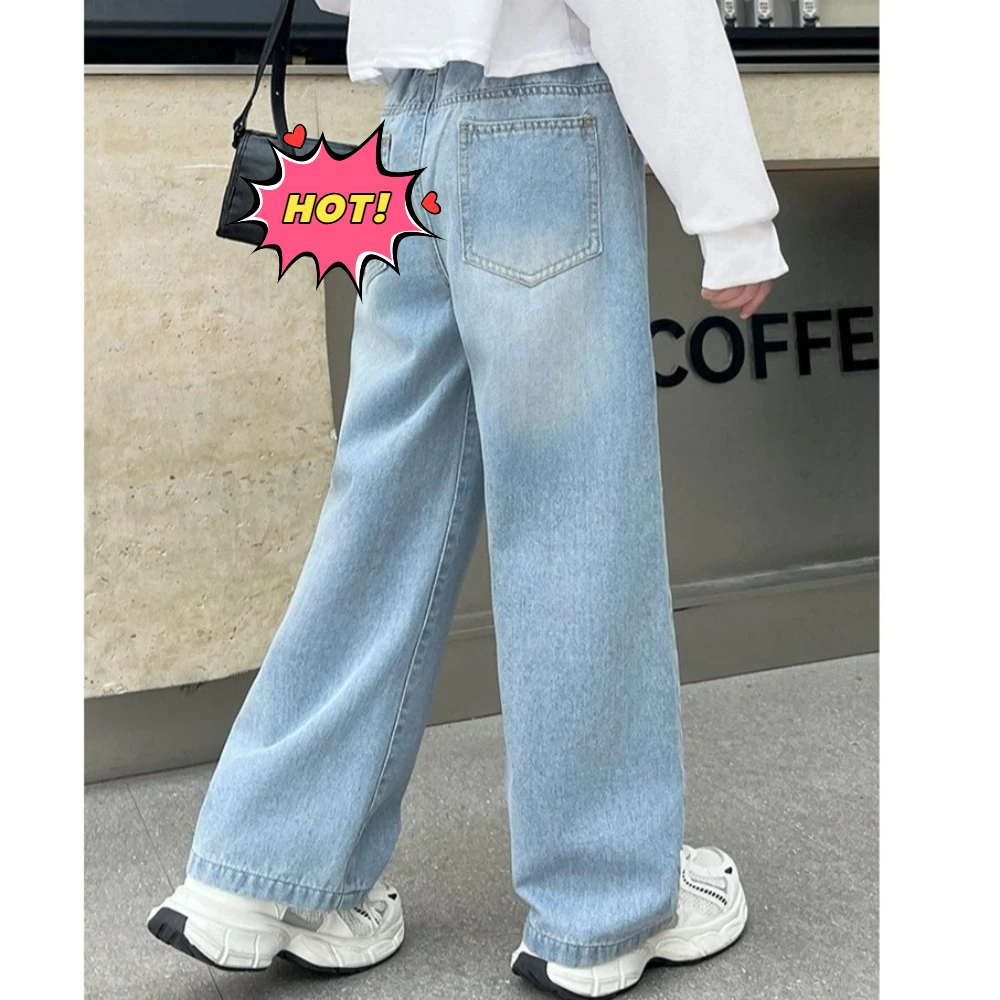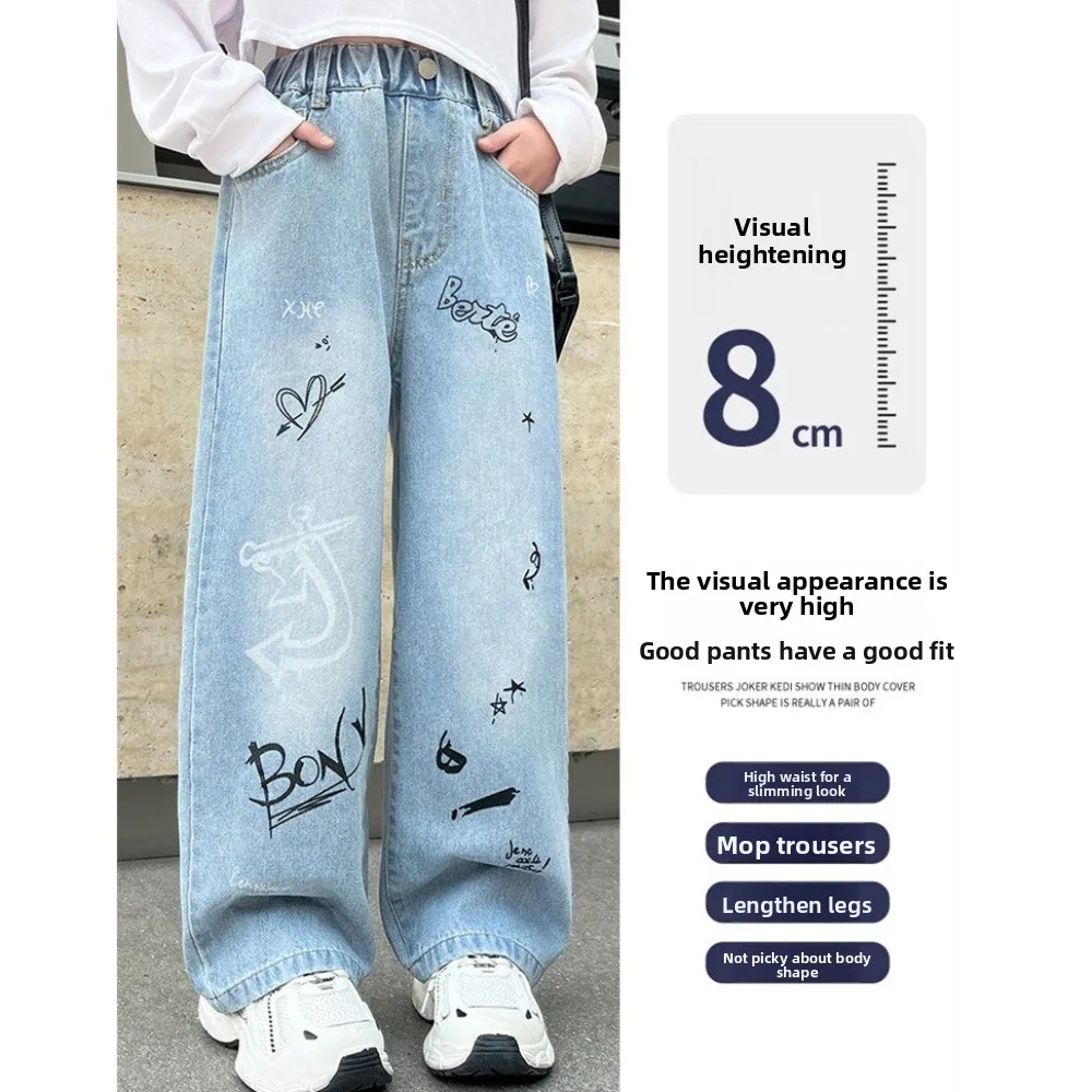 English Letter Children Jeans Straight Loose Leg Blue Teen Girl Jeans Korean Style High Waist Girls Denim Trousers Spring Autumn